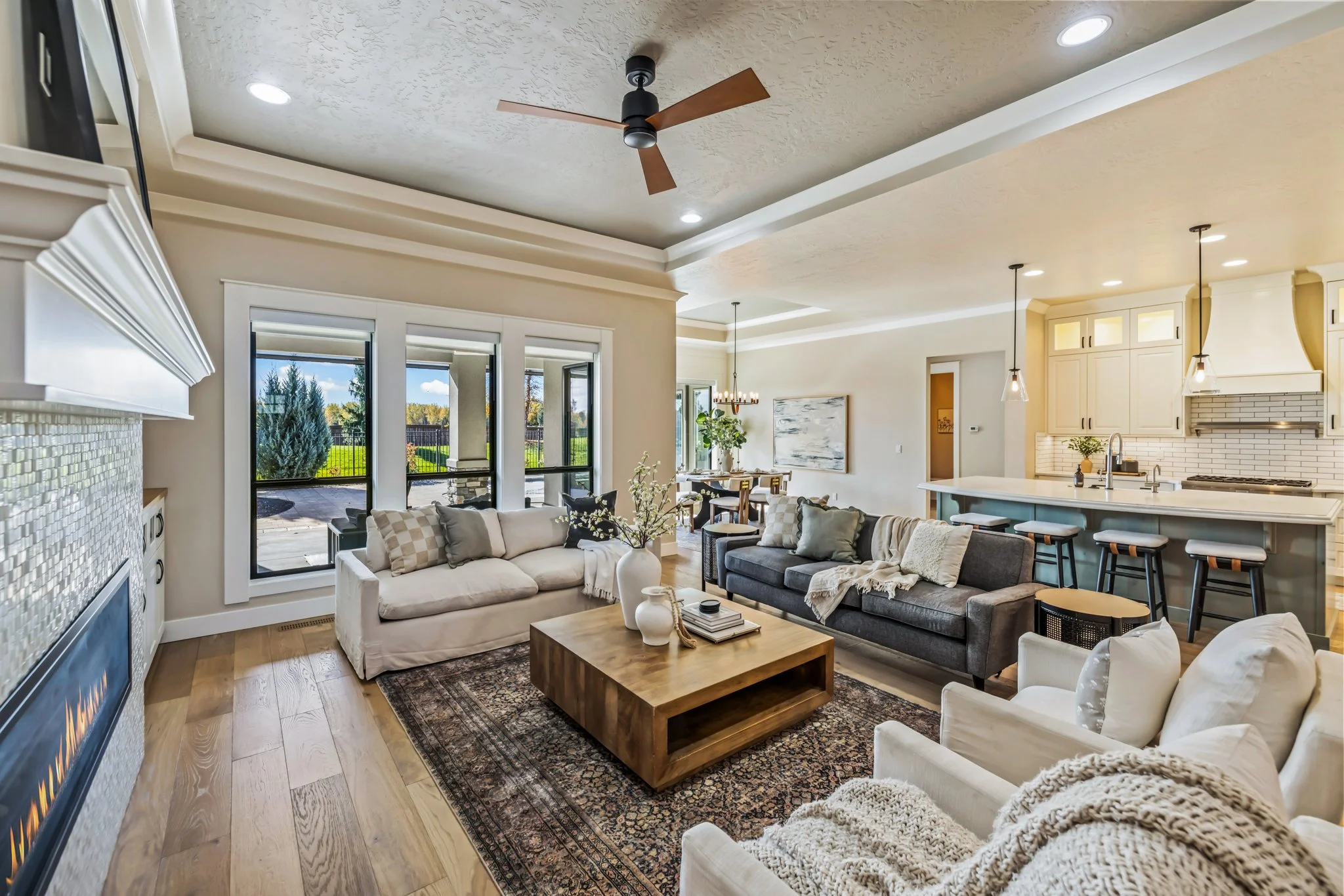 Experience luxury living in Williamson River Ranch, one of Eagle’s most desirable communities, offering quick access to the Boise River, Greenbelt, ponds, and nearby trails. Built in 2019, this home blends modern style with thoughtful upgrades throughout. The chef’s kitchen features Bosch and Thermador appliances, a built-in wine fridge, instant hot/cold filtered water, double ovens, and warming drawer. 10’ ceilings and expansive windows bring in abundant natural light, complemented by custom window coverings. The primary suite provides spa-level comfort with timed heated floors, quartz dual vanities, and designer tile accents. The impressive garage includes a tandem RV bay for 4 vehicles and brand-new epoxy floors. Outdoor living shines with a custom pool with motorized cover, built-in BBQ station, refrigerator, heaters, fan, and remote-controlled screens for year-round enjoyment. A whole-home water softener and central vacuum system complete this exceptional property — all just minutes from Eagle’s premier dining, shopping, and outdoor recreation. Residents also enjoy exclusive access to the clubhouse, community pool, and private waterfront green spaces.